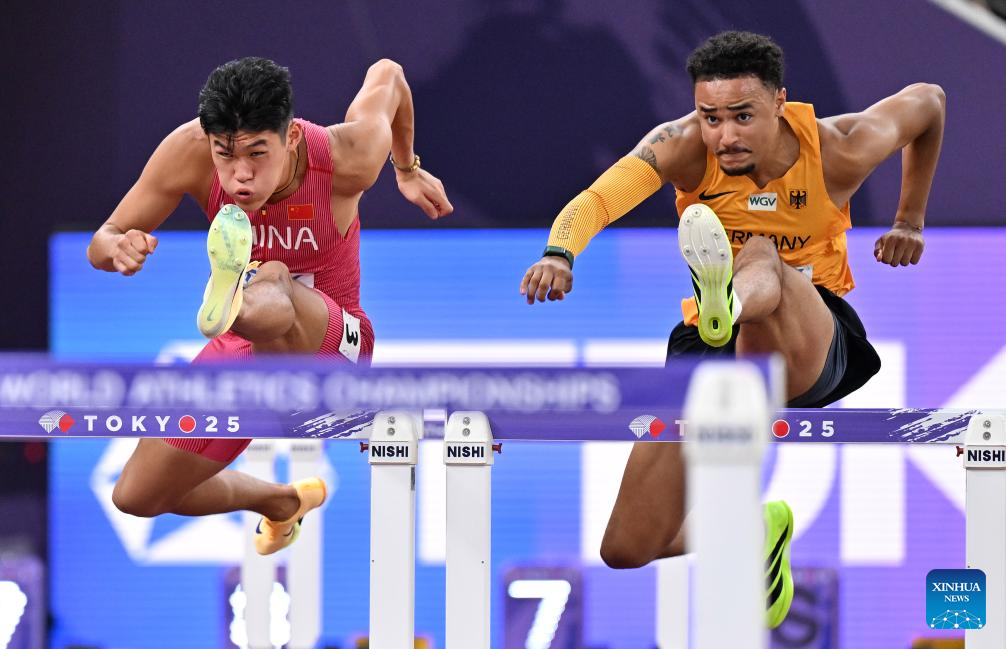 Liu Junxi (C) of China competes during the men's 110m hurdles heat at the 2025 World Athletics Championships in Tokyo, Japan, Sept. 15, 2025. (Xinhua/Lui Siu Wai)