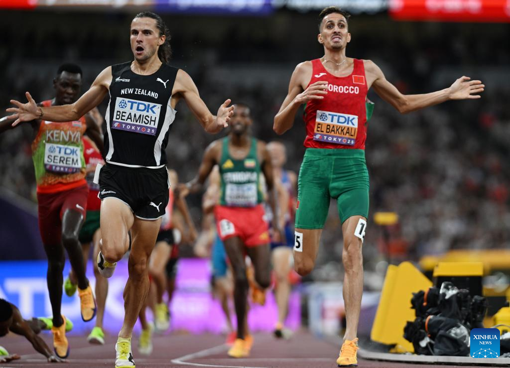Geordie Beamish (L) of New Zealand celebrates after crossing the finish line during the men's 3000m steeplechase final at the 2025 World Athletics Championships in Tokyo, Japan, Sept. 15, 2025. (Xinhua/Lui Siu Wai)