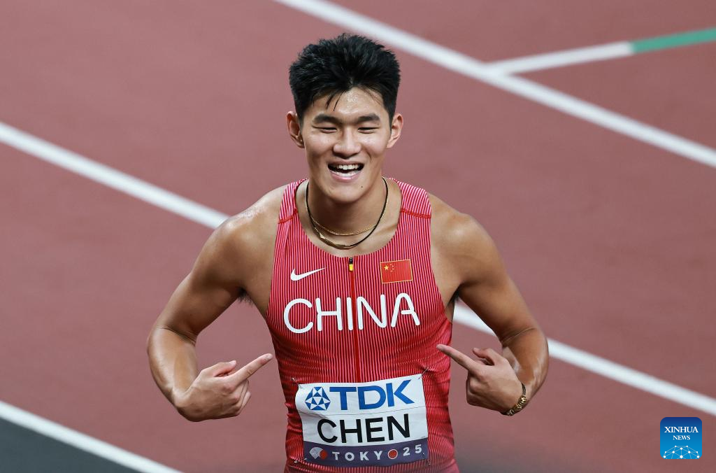 Chen Yuanjiang of China celebrates during the men's 110m hurdles heat at the 2025 World Athletics Championships in Tokyo, Japan, Sept. 15, 2025. (Xinhua/Jiang Han)