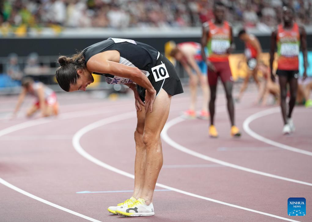 Gold medalist Geordie Beamish of New Zealand bows to the crowd after the men's 3000m steeplechase final at the 2025 World Athletics Championships in Tokyo, Japan, Sept. 15, 2025. (Xinhua/Ju Huanzong)