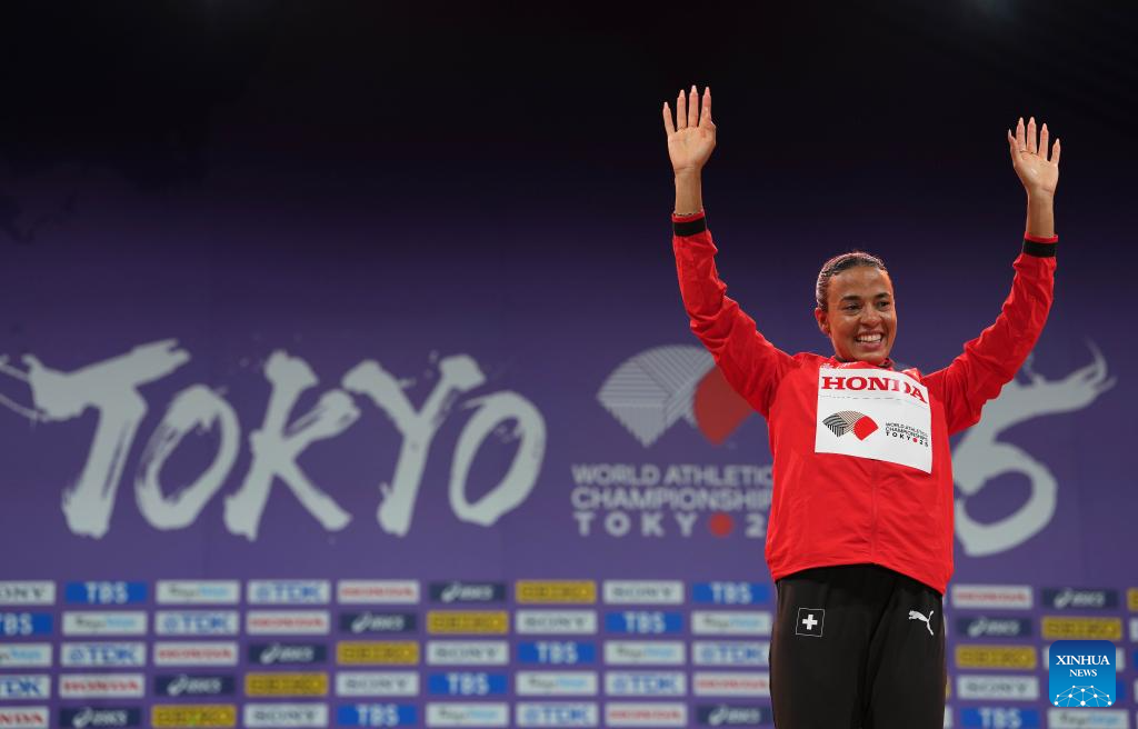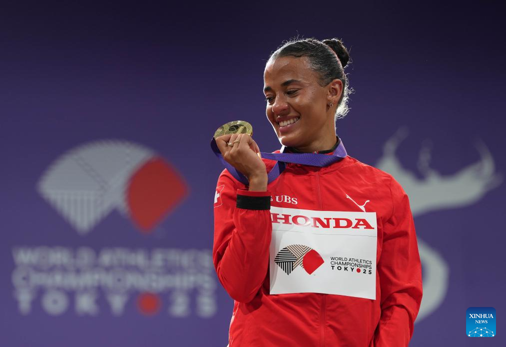 Gold medalist Ditaji Kambundji of Switzerland is seen during the women's 100m hurdles awarding ceremony at the 2025 World Athletics Championships in Tokyo, Japan, Sept. 16, 2025. (Xinhua/Jiang Han)