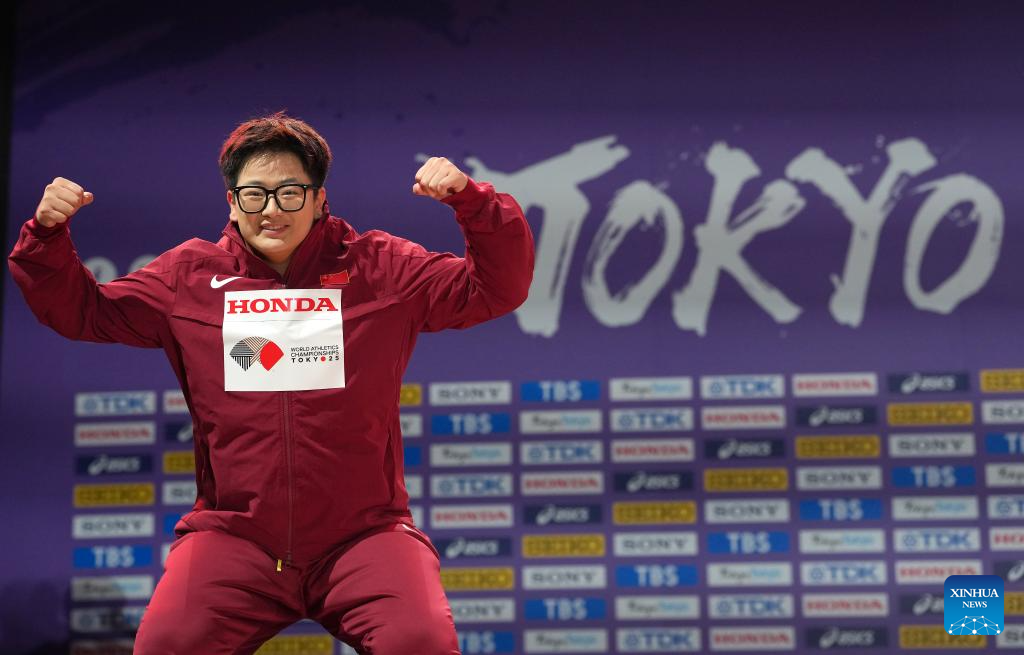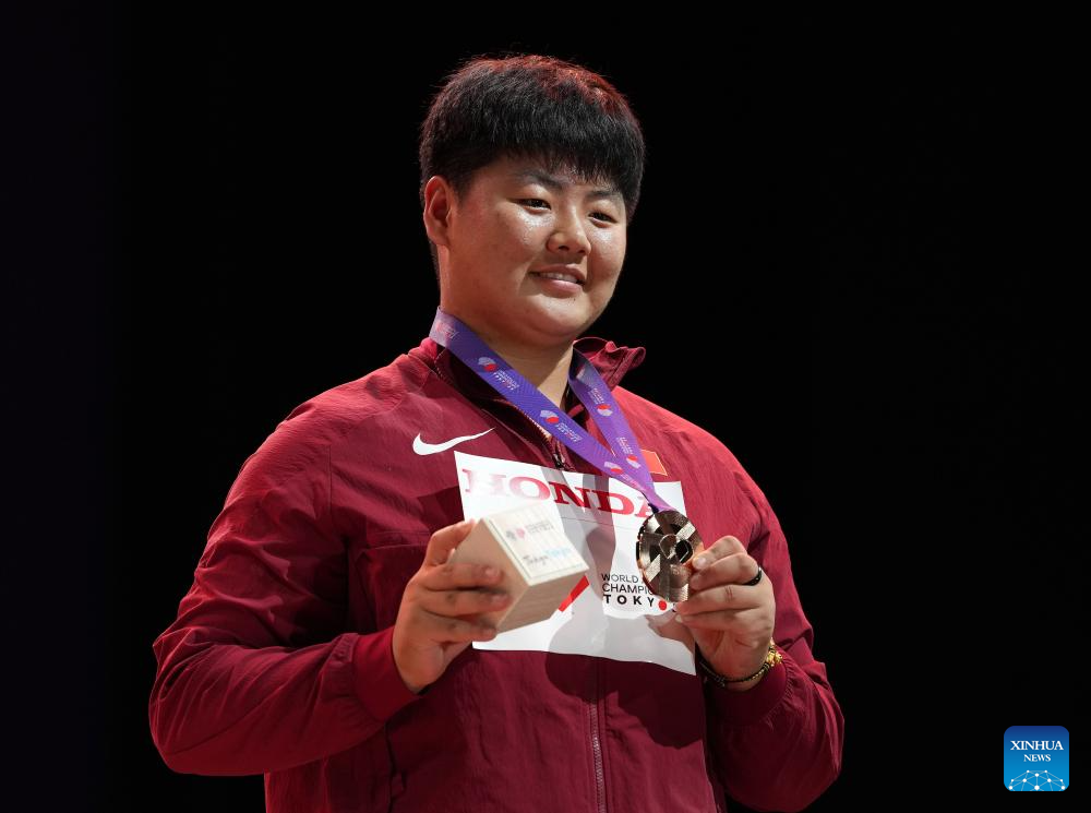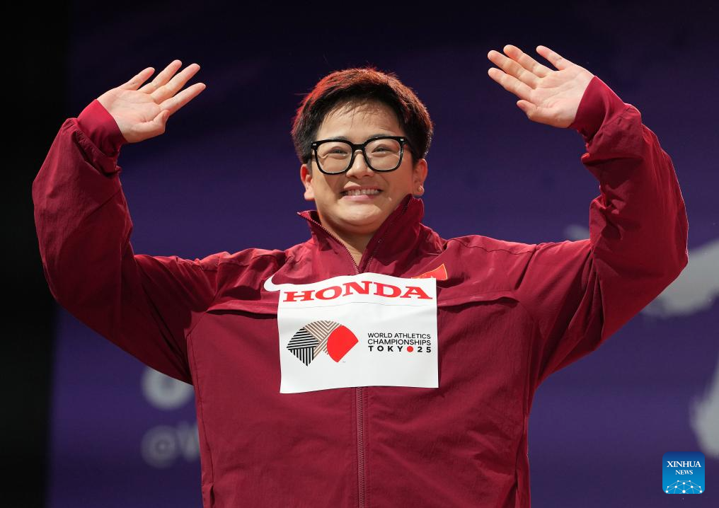 Bronze medalist Zhang Jiale of China poses the awarding ceremony of the women's hammer throw final at the 2025 World Athletics Championships in Tokyo, Japan, Sept. 16, 2025. (Xinhua/Jiang Han)