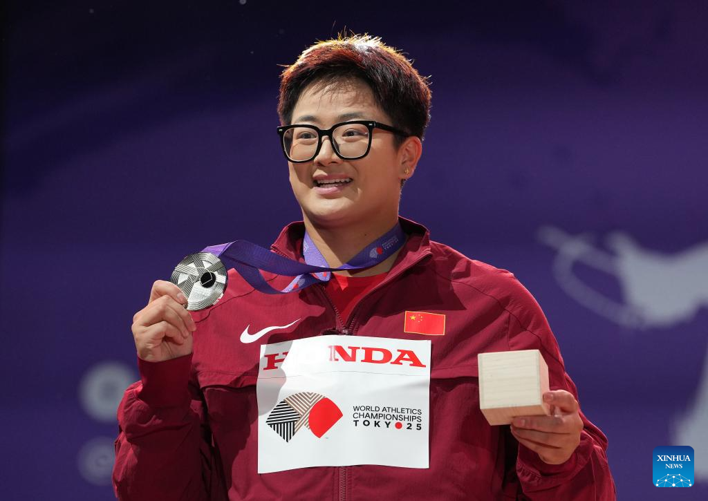 Silver medalist Zhao Jie of China poses during the awarding ceremony of the women's hammer throw final at the 2025 World Athletics Championships in Tokyo, Japan, Sept. 16, 2025. (Xinhua/Jiang Han)