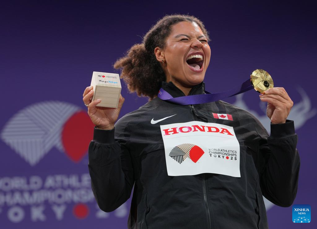 Gold medalist Camryn Rogers of Canada poses the awarding ceremony of the women's hammer throw final at the 2025 World Athletics Championships in Tokyo, Japan, Sept. 16, 2025. (Xinhua/Jiang Han)