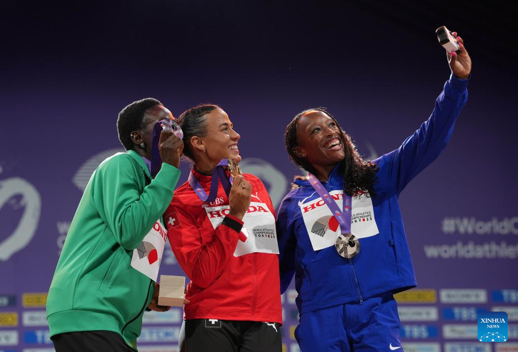 Gold medalist Ditaji Kambundji (C) of Switzerland, silver medalist Tobi Amusan of Nigeria (L) and bronze medalist Grace Stark of the United States pose for a selfie during the women's 100m hurdles awarding ceremony at the 2025 World Athletics Championships in Tokyo, Japan, Sept. 16, 2025. (Xinhua/Jiang Han)