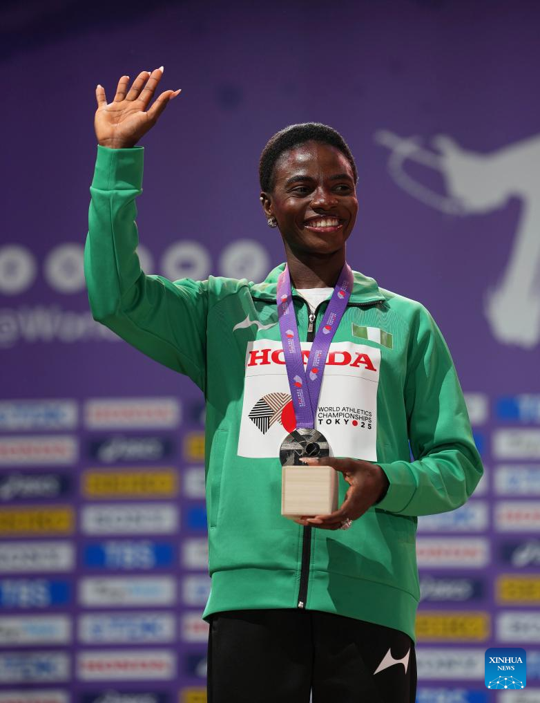 Silver medalist Tobi Amusan of Nigeria greets the spectators during the women's 100m hurdles awarding ceremony at the 2025 World Athletics Championships in Tokyo, Japan, Sept. 16, 2025. (Xinhua/Jiang Han)