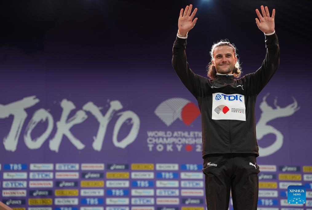 Gold medalist Geordie Beamish of New Zealand poses duirng the awarding ceremony of the men's 3000m steeplechase final at the 2025 World Athletics Championships in Tokyo, Japan, Sept. 16, 2025. (Xinhua/Jiang Han)
