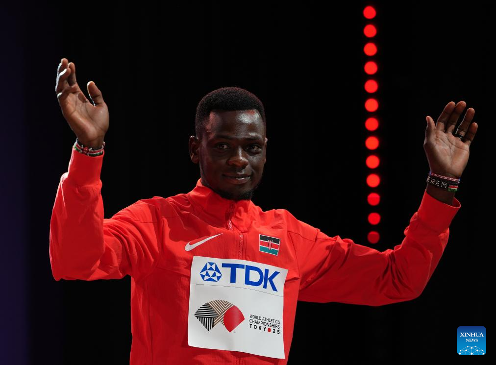 Bronze medalist Edmund Serem of Kenya poses during the awarding ceremony of the men's 3000m steeplechase final at the 2025 World Athletics Championships in Tokyo, Japan, Sept. 16, 2025. (Xinhua/Jiang Han)