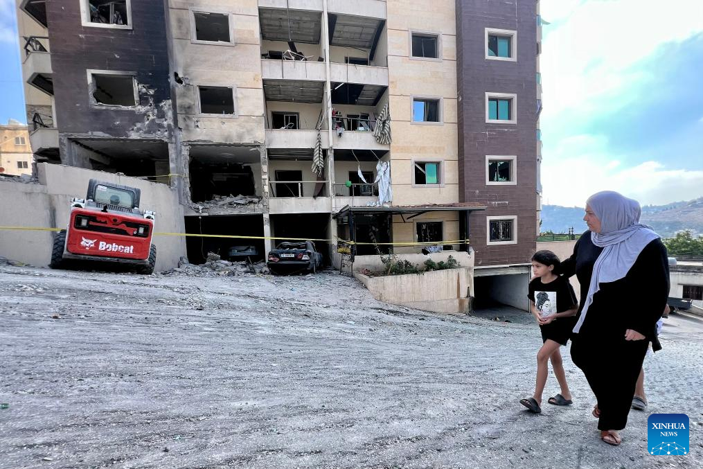 A woman and her child pass by a building attacked by Israeli forces in Nabatieh, southern Lebanon, on Sept. 16, 2025. The Israeli military said late on Monday it struck a Hezbollah command site in southern Lebanon, as cross-border tensions persist despite a ceasefire. (Photo by Ali Hashisho/Xinhua)