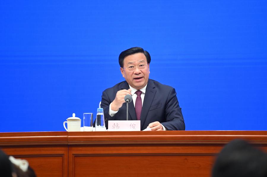 Chinese Minister of Agriculture and Rural Affairs Han Jun attends a press conference held by the State Council Information Office (SCIO) on achievements in agricultural and rural development during the 14th Five-Year Plan period (2021-2025) in Beijing, capital of China, Sept. 16, 2025. (Xinhua/Chen Yehua)