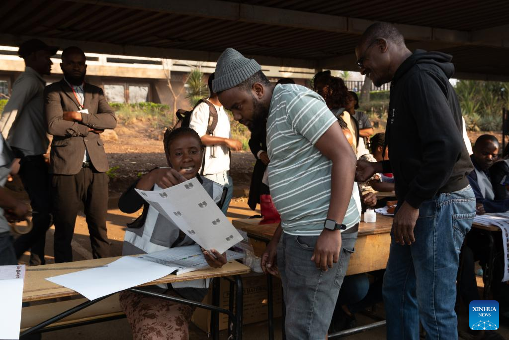 Political party monitors and Malawi Electoral Commission (MEC) officers count ballots at a polling station in Blantyre, Malawi, Sept. 16, 2025. The much-awaited voting exercise started at 6 a.m. local time on Tuesday, with long queues at polling centers across the country.