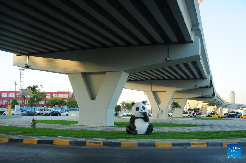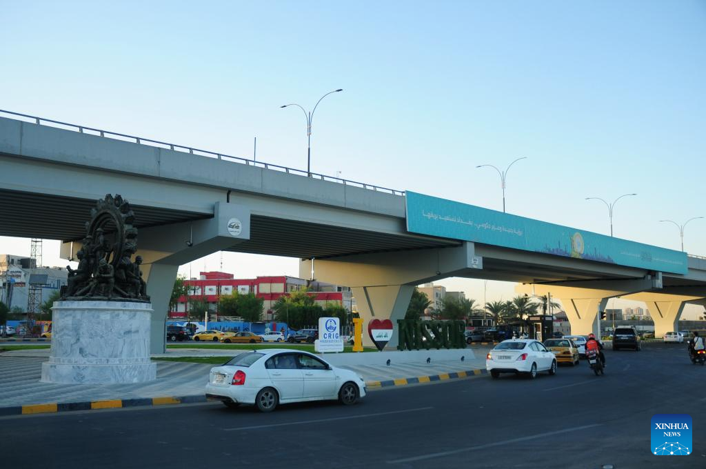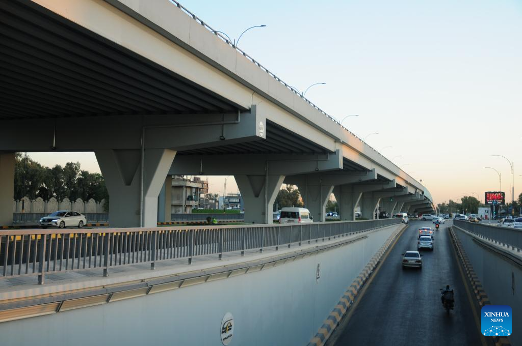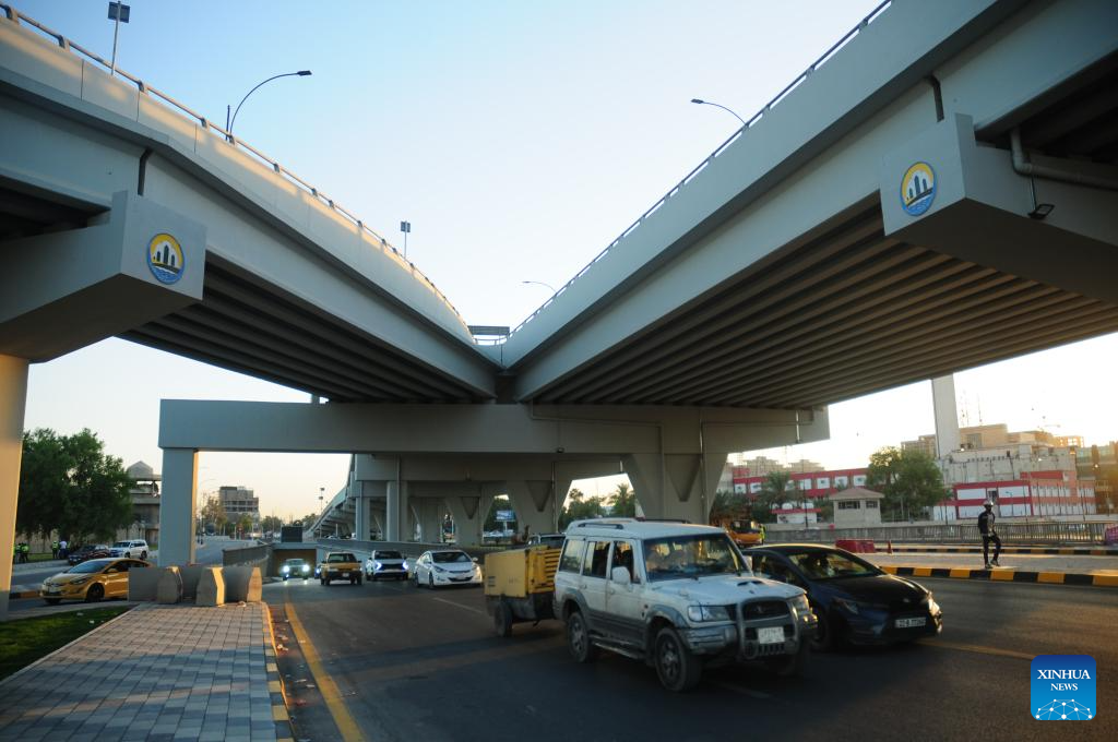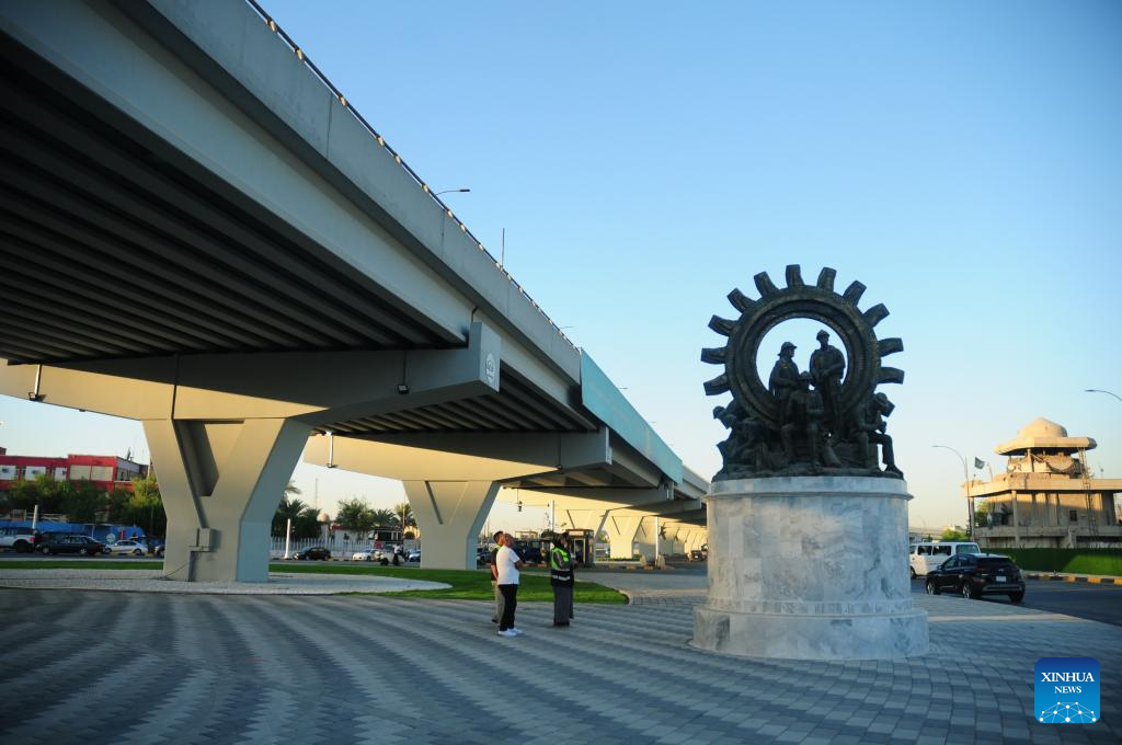 This photo taken on Sept. 15, 2025 shows an overpass of the Nisour multi-tiered transportation hub and the renovated Nisour Square in Baghdad, Iraq. The Nisour multi-tiered transportation hub was completed and opened to traffic here on Monday. The project, including two overpasses and five tunnels, is built by Chinese company Transtech. (Xinhua/Duan Minfu)