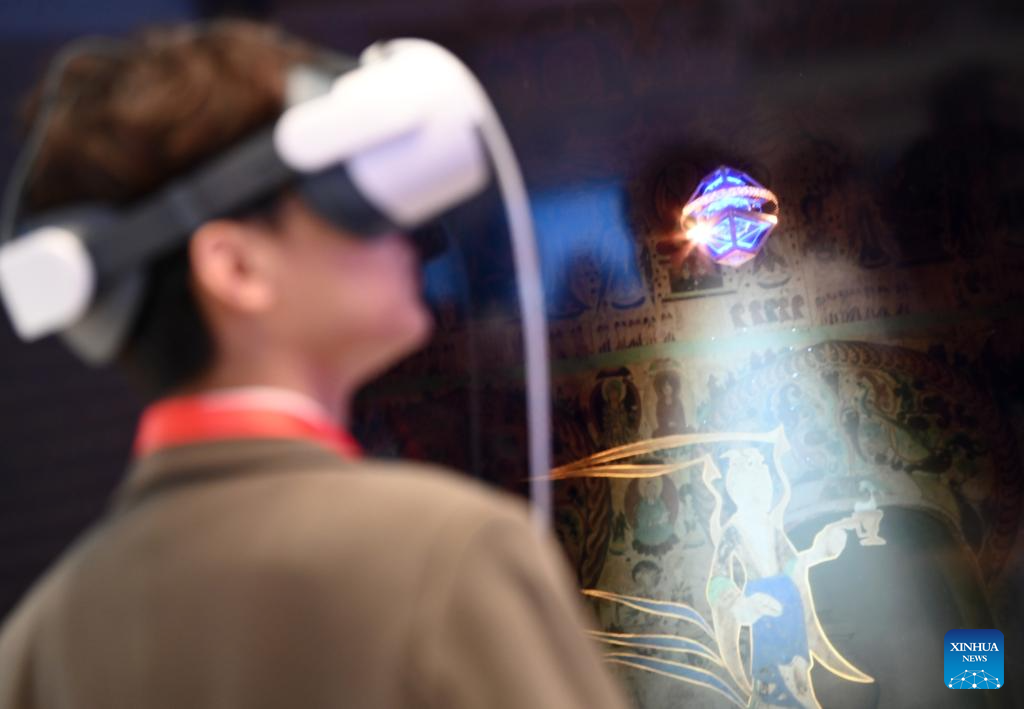 A guest watches digital content on Dunhuang research with a VR device during an exhibition of the 2025 World Internet Conference Cultural Heritage Digitalization Forum in Xi'an, northwest China's Shaanxi Province, Sept. 17, 2025. The forum opened on Wednesday in Xi'an, home to the world-famous Terracotta Warriors.
