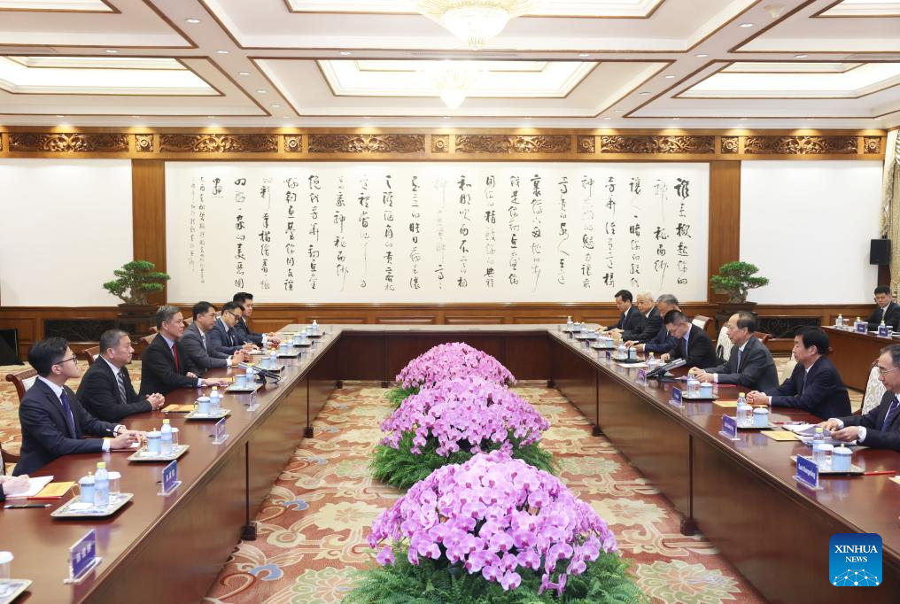 Shi Taifeng, a member of the Political Bureau of the Communist Party of China (CPC) Central Committee and head of the CPC Central Committee's Organization Department, meets with Chan Chun Sing, Singapore's Coordinating Minister for Public Services and Minister for Defence, in Beijing, capital of China, Sept. 17, 2025. (Xinhua/Liu Weibing)