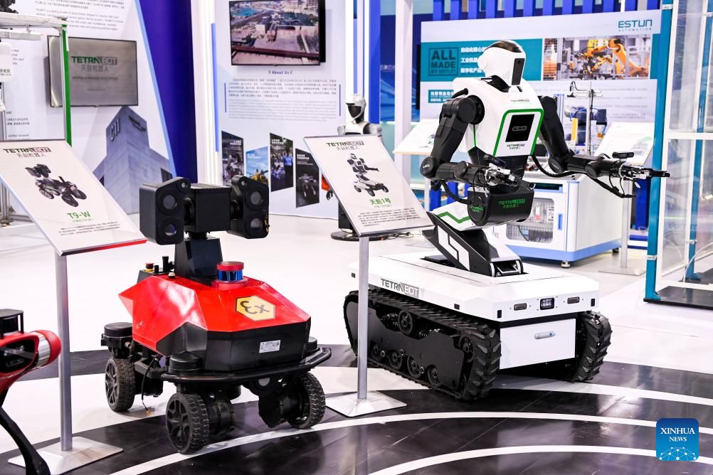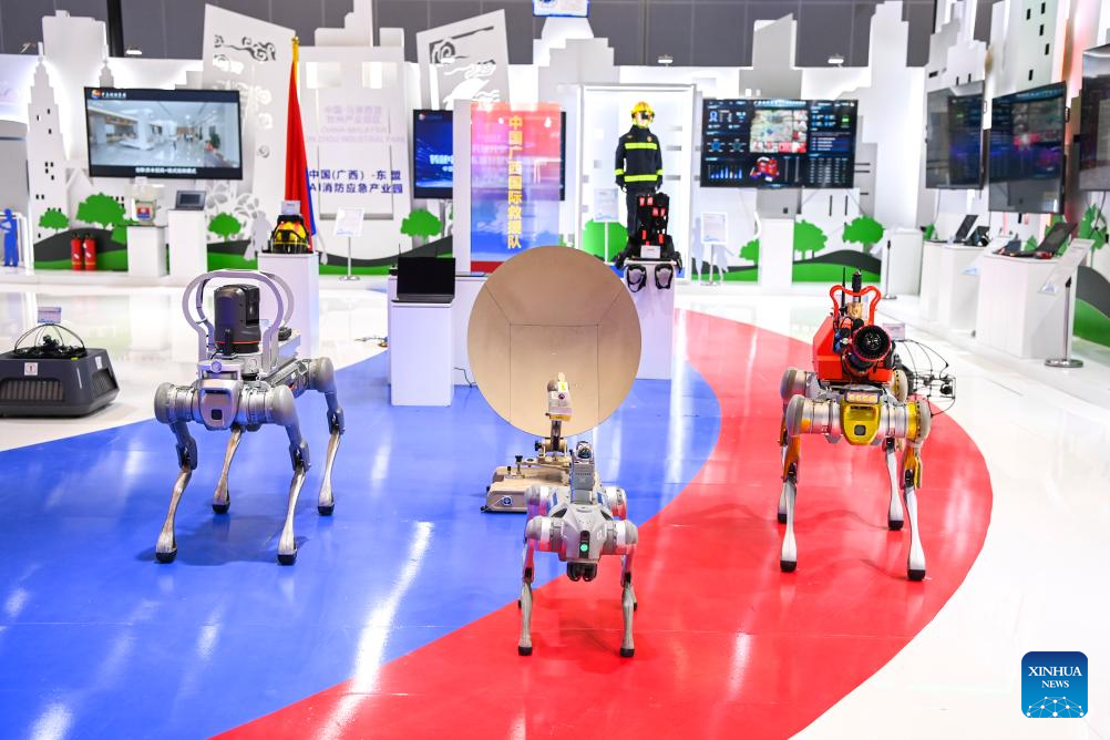AI-powered firefighting devices are seen at Nanning International Convention and Exhibition Center in Nanning, capital of south China's Guangxi Zhuang Autonomous Region, Sept. 17, 2025. The 22nd China-ASEAN Expo and the China-ASEAN Business and Investment Summit kicked off here on Wednesday. (Xinhua/Cao Yiming)