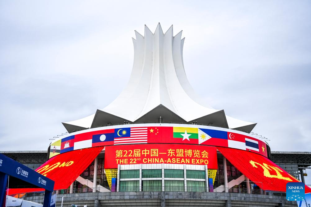 This photo taken on Sept. 17, 2025 shows an exterior view of Nanning International Convention and Exhibition Center in Nanning, capital of south China's Guangxi Zhuang Autonomous Region. The 22nd China-ASEAN Expo and the China-ASEAN Business and Investment Summit kicked off here on Wednesday. (Xinhua/Huang Xiaobang)