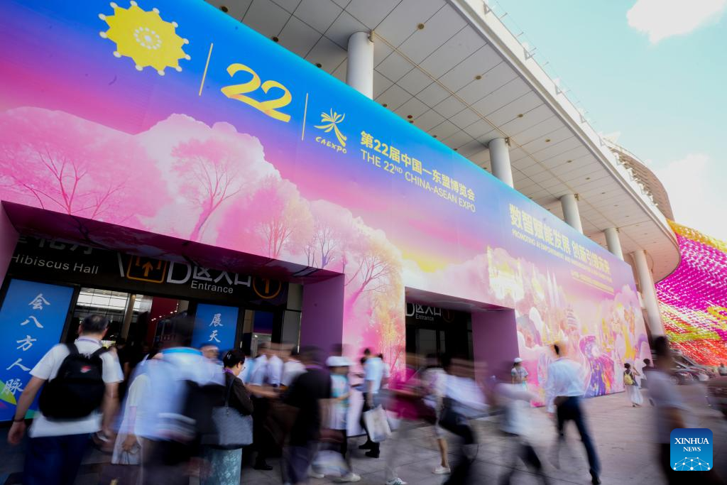 People are pictured outside the venue of the Nanning International Convention and Exhibition Center in Nanning, capital of south China's Guangxi Zhuang Autonomous Region, Sept. 17, 2025. The 22nd China-ASEAN Expo and the China-ASEAN Business and Investment Summit kicked off here on Wednesday. (Xinhua/Lu Boan)