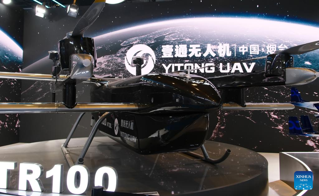 This photo shows an unmanned aerial vehicle displayed at the Nanning International Convention and Exhibition Center in Nanning, capital of south China's Guangxi Zhuang Autonomous Region, Sept. 17, 2025. The 22nd China-ASEAN Expo and the China-ASEAN Business and Investment Summit kicked off here on Wednesday. (Xinhua/Hu Qiusi)