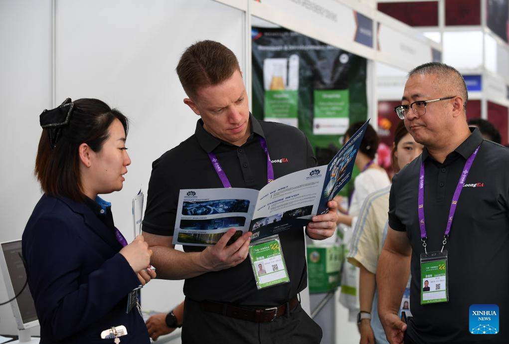People communicate during the 22nd China-ASEAN Expo at Nanning International Convention and Exhibition Center in Nanning, capital of south China's Guangxi Zhuang Autonomous Region, Sept. 17, 2025. The 22nd China-ASEAN Expo and the China-ASEAN Business and Investment Summit kicked off here on Wednesday. (Xinhua/Lu Boan)