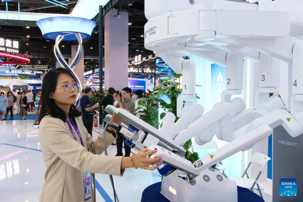 A staff member demonstrates a surgical robot at the Nanning International Convention and Exhibition Center in Nanning, capital of south China's Guangxi Zhuang Autonomous Region, Sept. 17, 2025. The 22nd China-ASEAN Expo and the China-ASEAN Business and Investment Summit kicked off here on Wednesday. (Xinhua/Hu Qiusi)