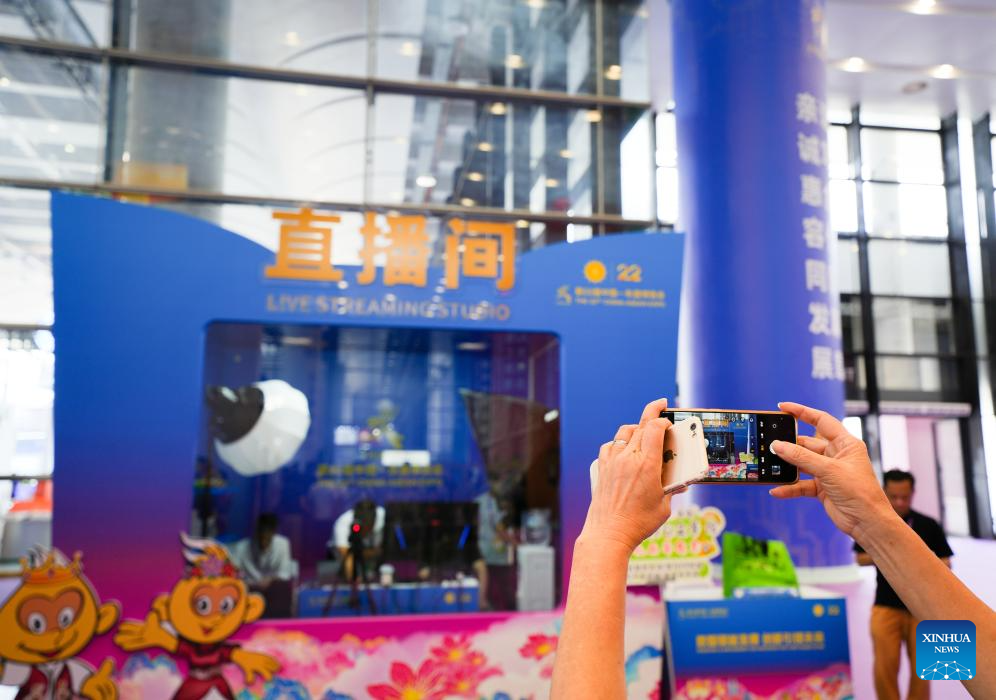 A visitor takes photos of the livestreaming studio at the Nanning International Convention and Exhibition Center in Nanning, capital of south China's Guangxi Zhuang Autonomous Region, Sept. 17, 2025. The 22nd China-ASEAN Expo and the China-ASEAN Business and Investment Summit kicked off here on Wednesday. (Xinhua/Zhou Tinglu)