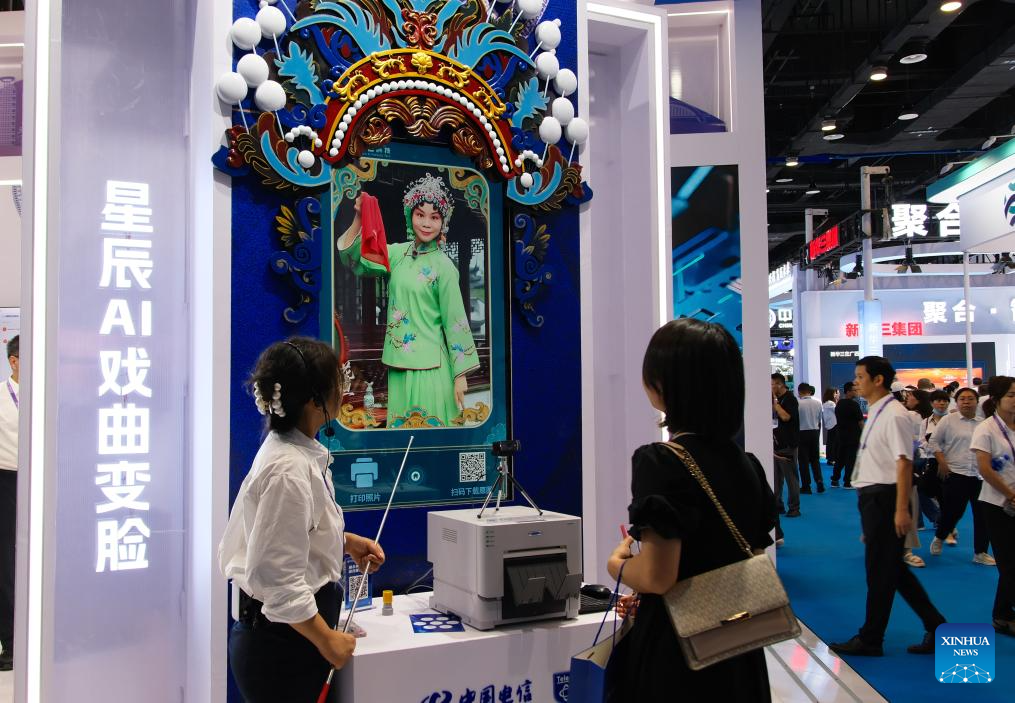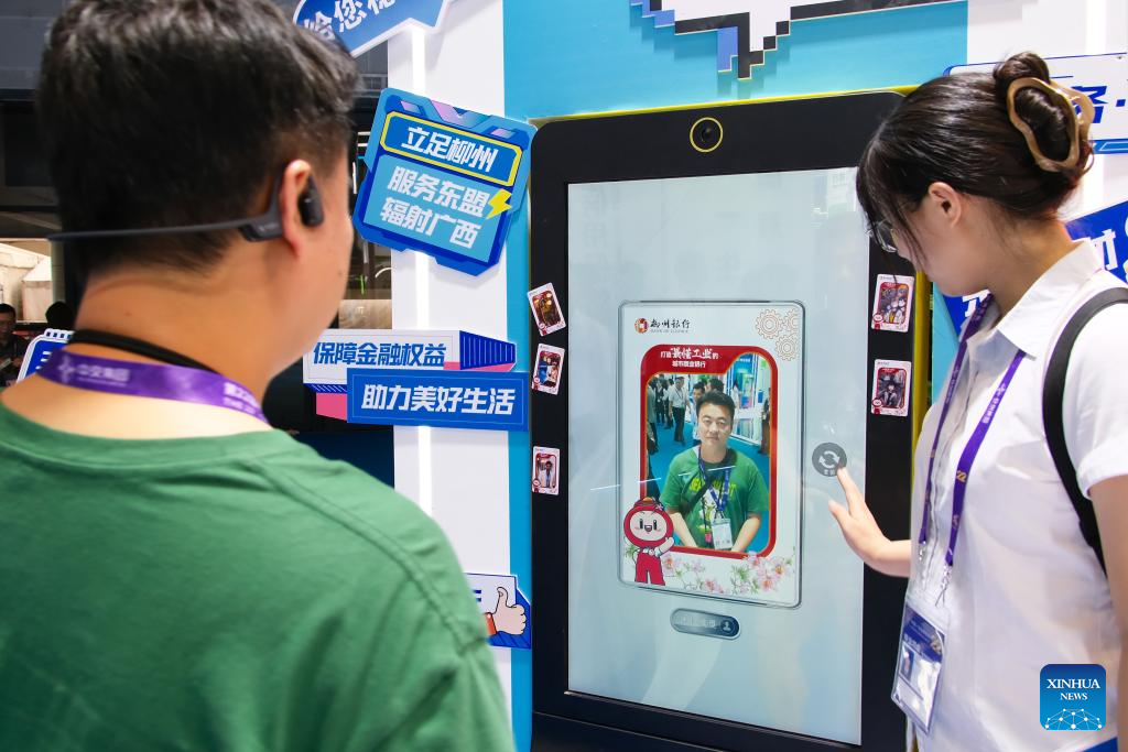 A visitor tries an AI-powered face-switching installation at the Nanning International Convention and Exhibition Center in Nanning, capital of south China's Guangxi Zhuang Autonomous Region, Sept. 17, 2025. The 22nd China-ASEAN Expo and the China-ASEAN Business and Investment Summit kicked off here on Wednesday. (Xinhua/Hu Qiusi)