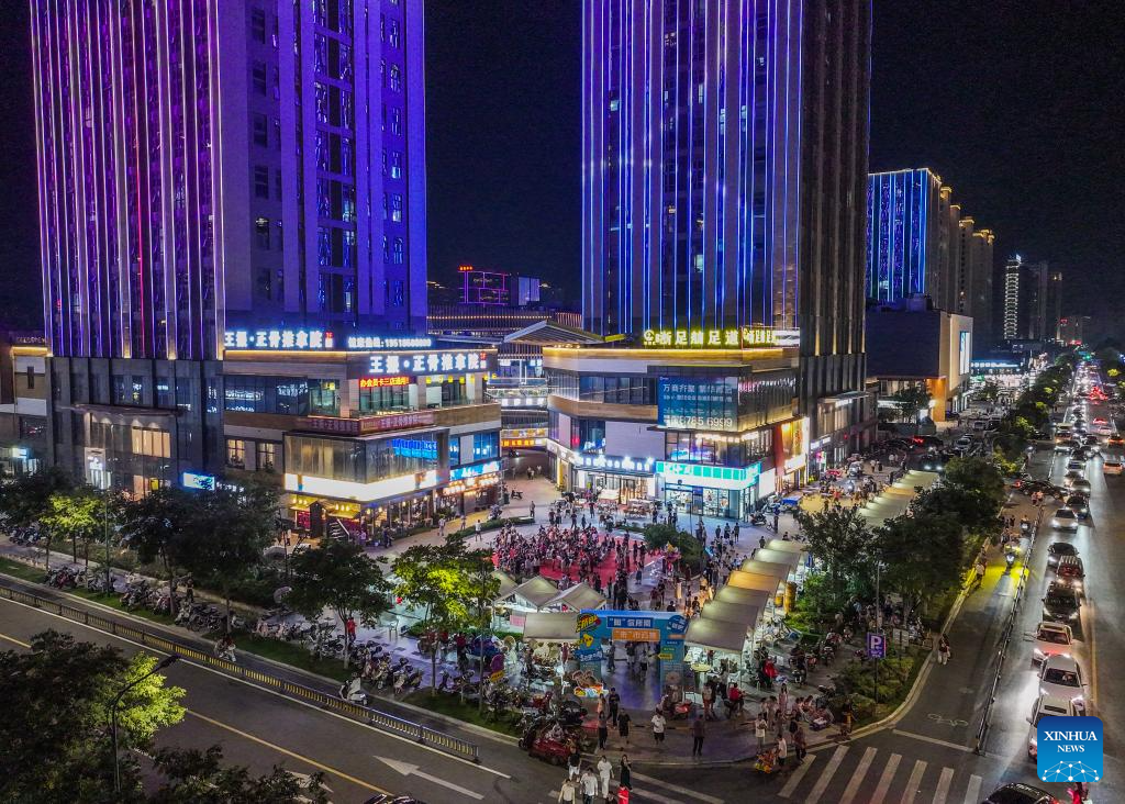 An aerial drone photo taken on Sept. 16, 2025 shows a market set up next to the Zhuji city basketball center in Taozhu Street of Zhuji, east China's Zhejiang Province. A market has recently been set up next to the Zhuji city basketball center, a venue for ZheBA, Zhejiang's province-wide community basketball league. The market serves as a multi-business platform which combines sports, shopping and catering. (Xinhua/Xu Yu)