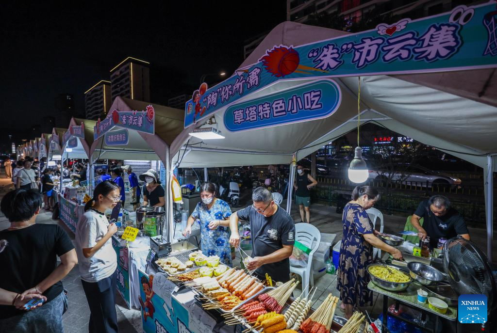 Citizens buy local specialty foods at a market set up next to the Zhuji city basketball center in Taozhu Street of Zhuji, east China's Zhejiang Province, on Sept. 16, 2025. A market has recently been set up next to the Zhuji city basketball center, a venue for ZheBA, Zhejiang's province-wide community basketball league. The market serves as a multi-business platform which combines sports, shopping and catering. (Xinhua/Xu Yu)