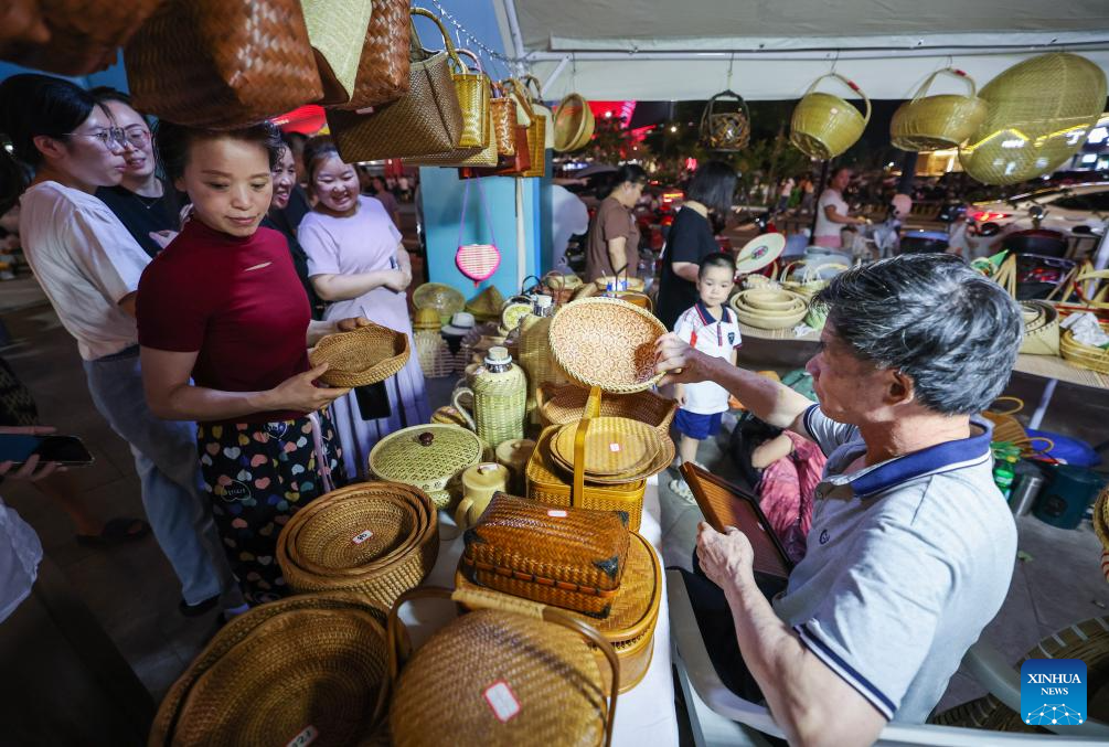 Citizens buy traditional bamboo products at a market set up next to the Zhuji city basketball center in Taozhu Street of Zhuji, east China's Zhejiang Province, on Sept. 16, 2025. A market has recently been set up next to the Zhuji city basketball center, a venue for ZheBA, Zhejiang's province-wide community basketball league. The market serves as a multi-business platform which combines sports, shopping and catering. (Xinhua/Xu Yu)