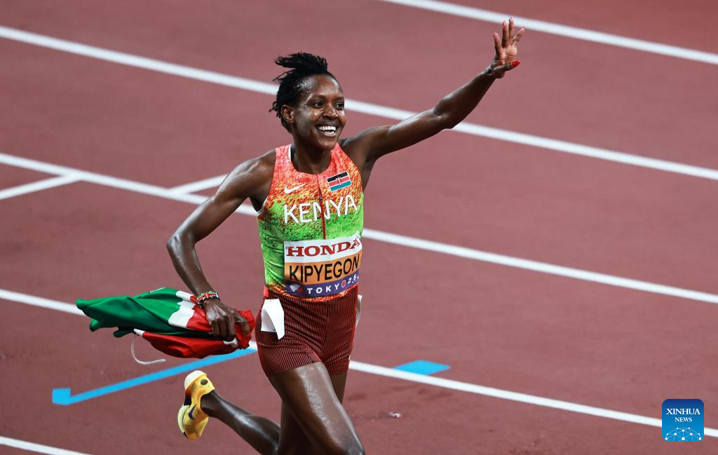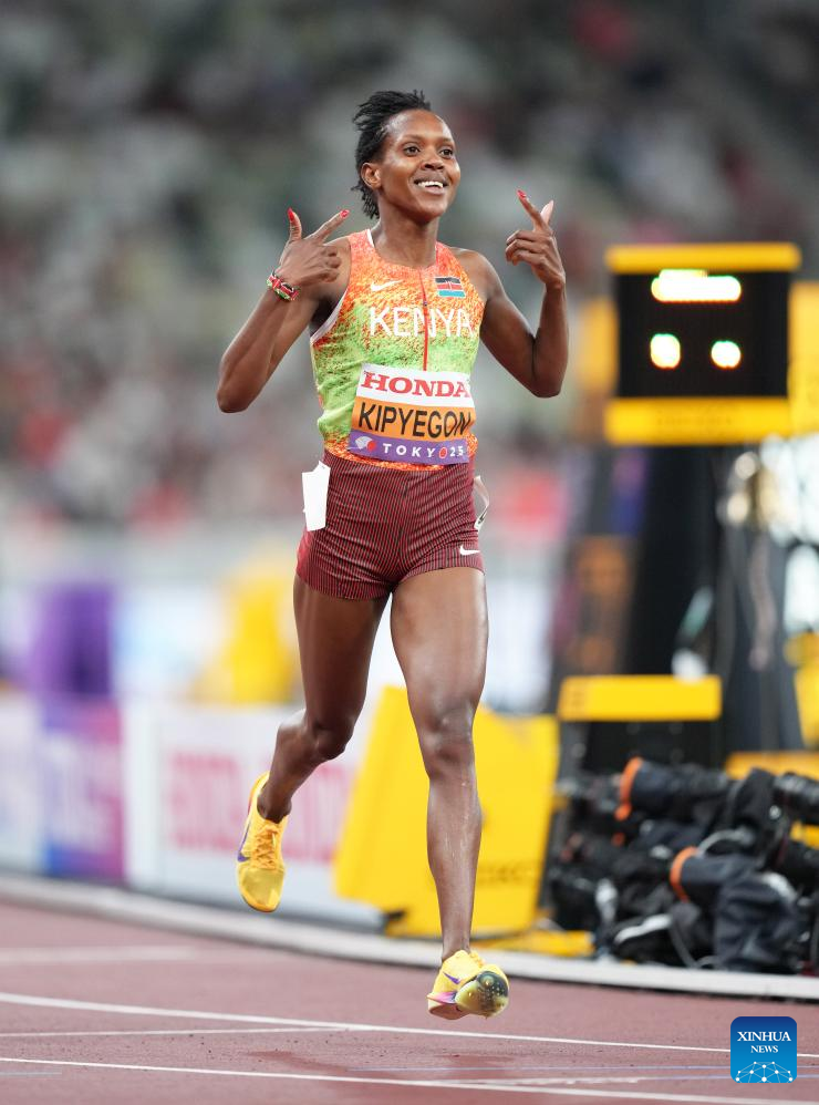 Gold medalist Faith Kipyegon of Kenya celebrates after the women's 1500m final at the 2025 World Athletics Championships in Tokyo, Japan, Sept. 16, 2025. (Xinhua/Jiang Han)