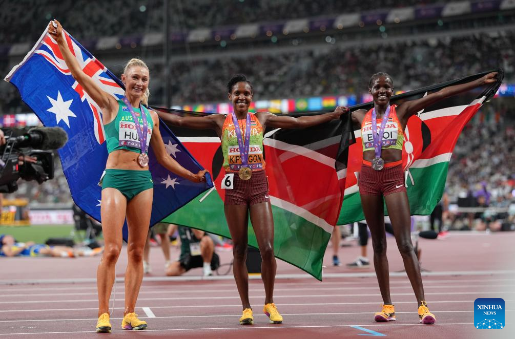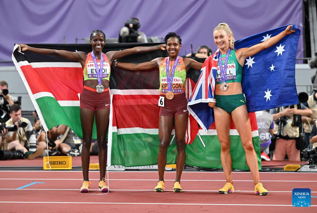 Gold medalist Faith Kipyegon (C) of Kenya, silver medalist Dorcus Ewoi (L) of Kenya and bronze medalist Jessica Hull of Australia pose for photos after the women's 1500m final at the 2025 World Athletics Championships in Tokyo, Japan, Sept. 16, 2025. (Xinhua/Song Yanhua)