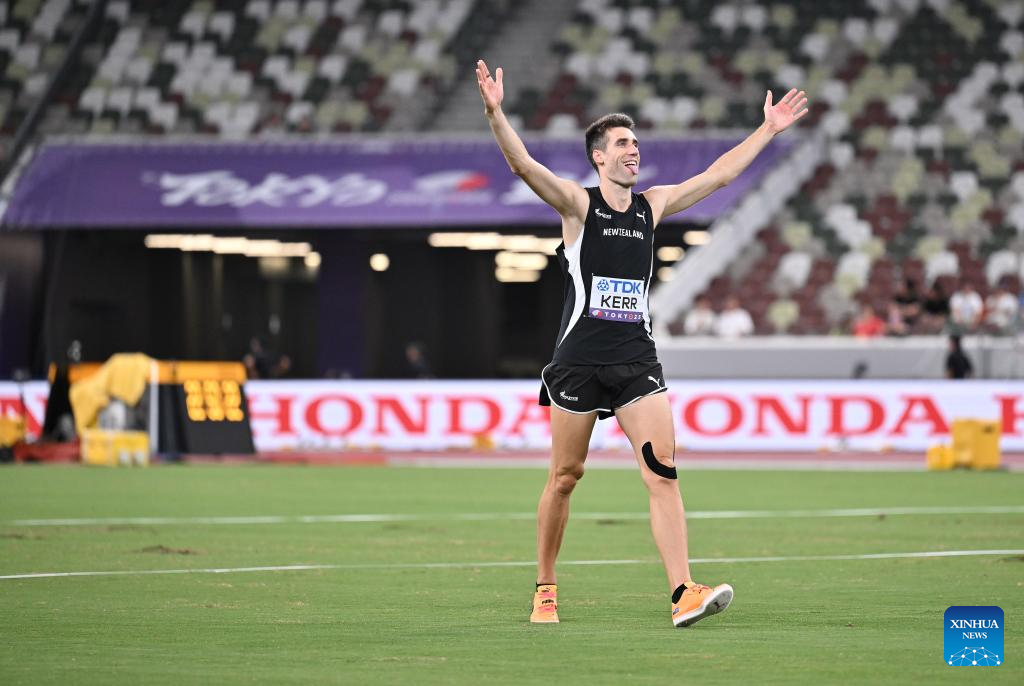 Hamish Kerr of New Zealand celebrates after the men's high jump final at the 2025 World Athletics Championships in Tokyo, Japan, Sept. 16, 2025. (Xinhua/Jia Haocheng)