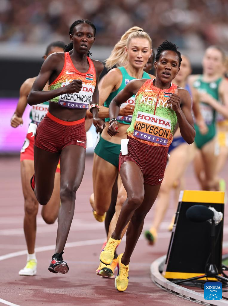Faith Kipyegon (R) of Kenya competes during the women's 1500m final at the 2025 World Athletics Championships in Tokyo, Japan, Sept. 16, 2025. (Xinhua/Jia Haocheng)