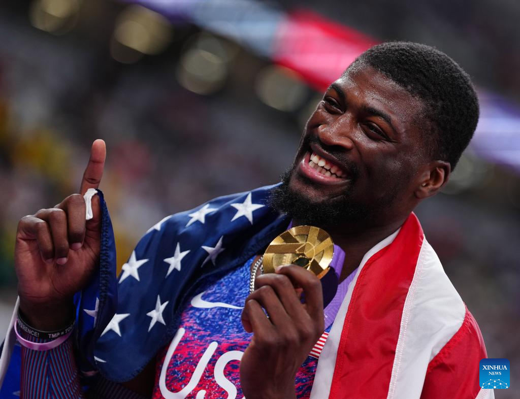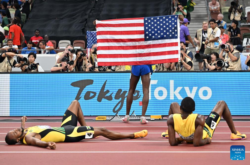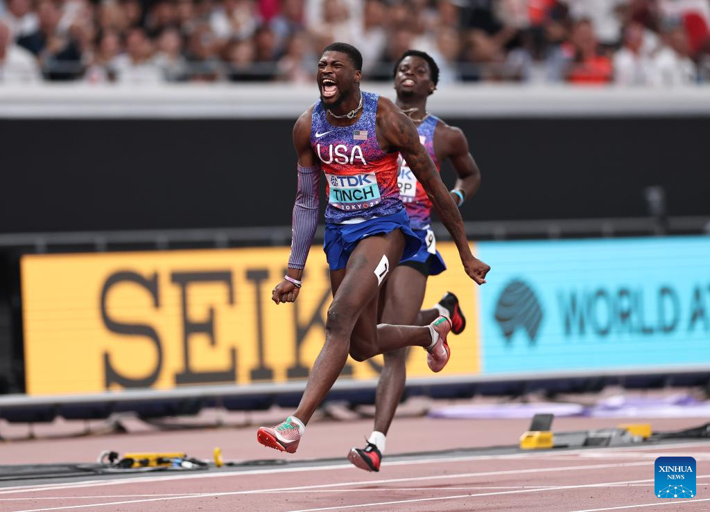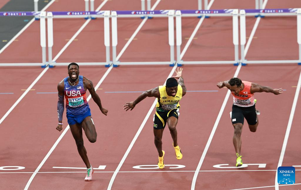 Cordell Tinch (C) of The United States celebrates after the men's 110m hurdles final at the 2025 World Athletics Championships in Tokyo, Japan, Sept. 16, 2025. (Xinhua/Song Yanhua)