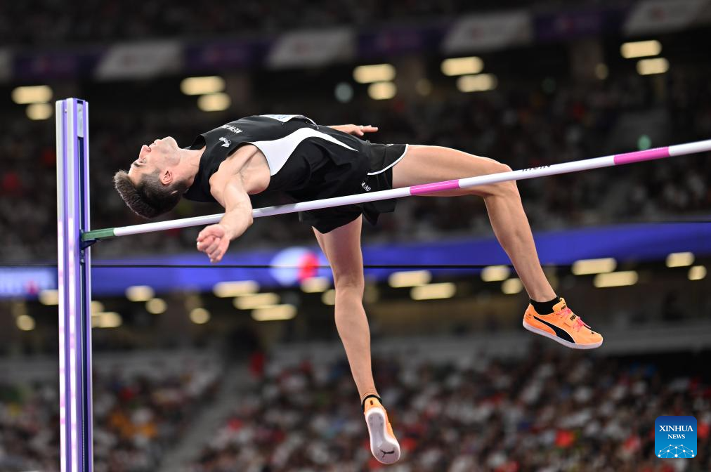 Hamish Kerr of New Zealand competes during the men's high jump final at the 2025 World Athletics Championships in Tokyo, Japan, Sept. 16, 2025. (Xinhua/Song Yanhua)