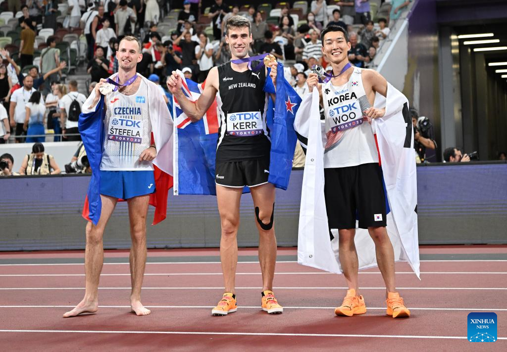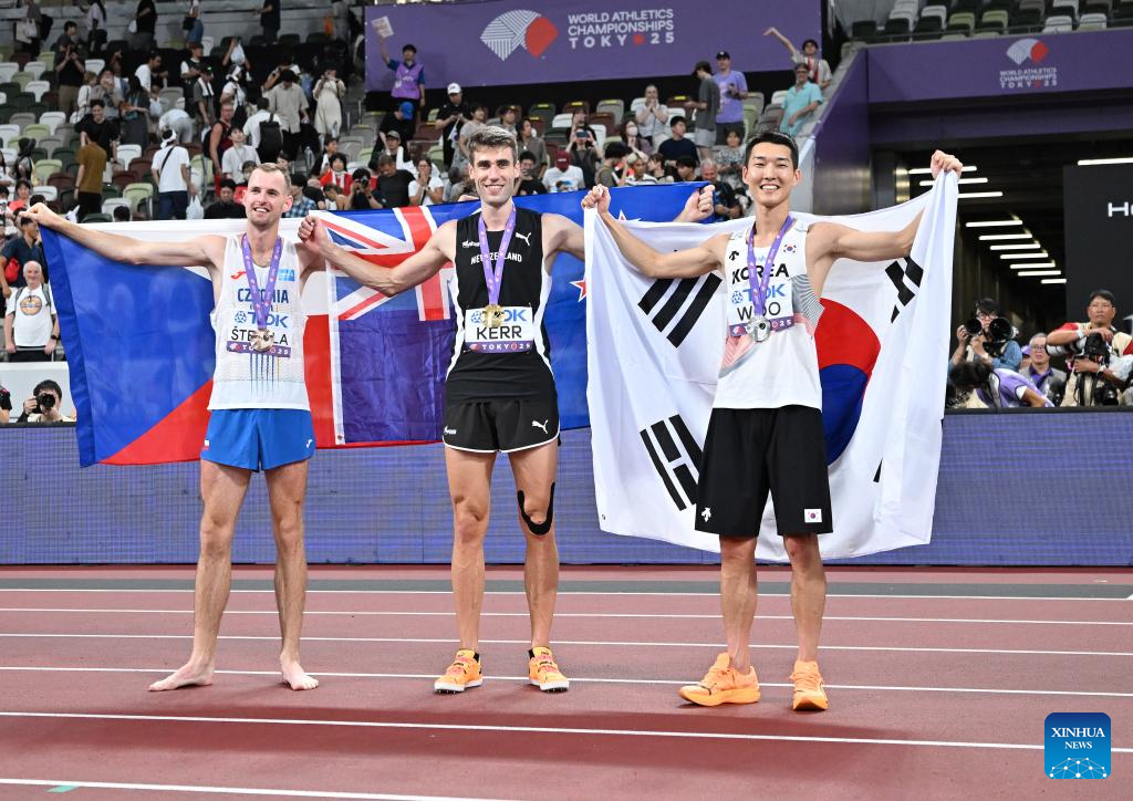 Hamish Kerr (C) of New Zealand, Woo Sanghyeok (R) of South Korea and Jan Stefela of the Czech Republic celebrate after the men's high jump final at the 2025 World Athletics Championships in Tokyo, Japan, Sept. 16, 2025. (Xinhua/Song Yanhua)