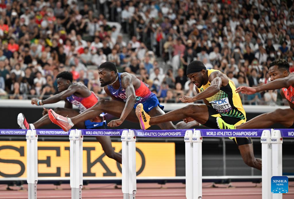 Cordell Tinch (2nd L) of The United States competes during the men's 110m hurdles final at the 2025 World Athletics Championships in Tokyo, Japan, Sept. 16, 2025. (Xinhua/Song Yanhua)