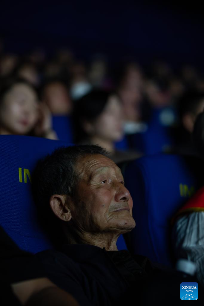 A family member of the victim watches the film "Evil Unbound" in Harbin, northeast China's Heilongjiang Province, Sept. 17, 2025. "Evil Unbound," a film about Unit 731, held its world premiere on Wednesday in Harbin, where this notorious Japanese germ warfare unit was once based, highlighting the atrocities committed by Japanese invading forces in China in World War II.