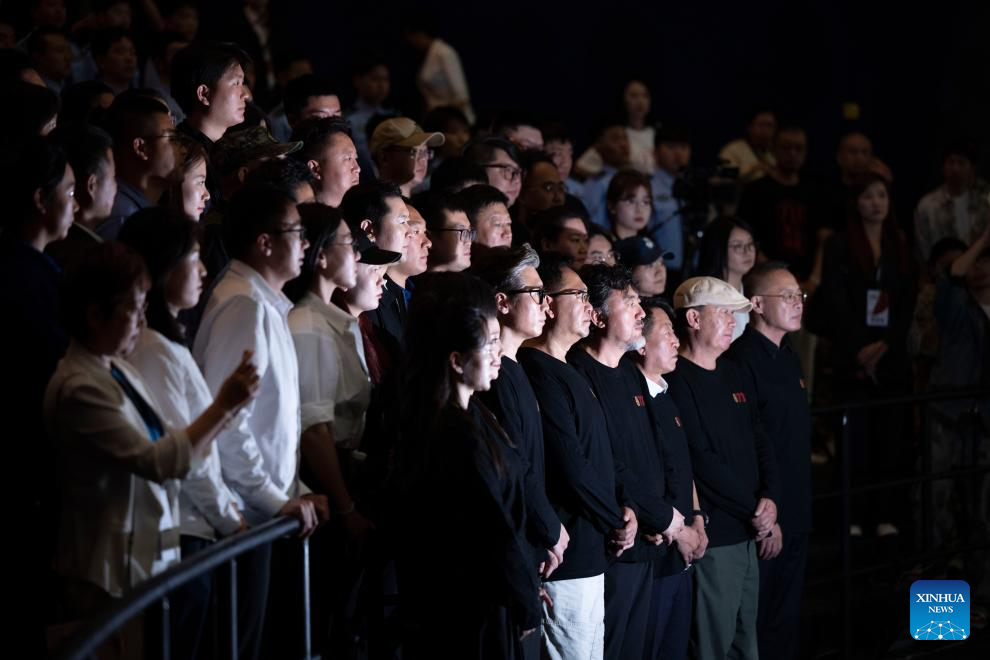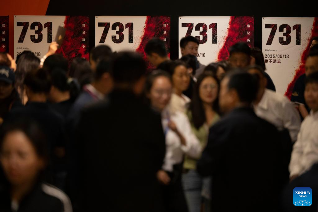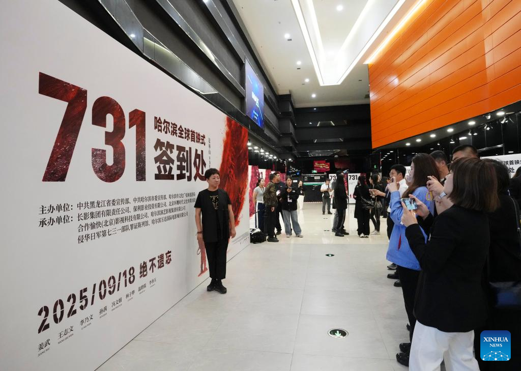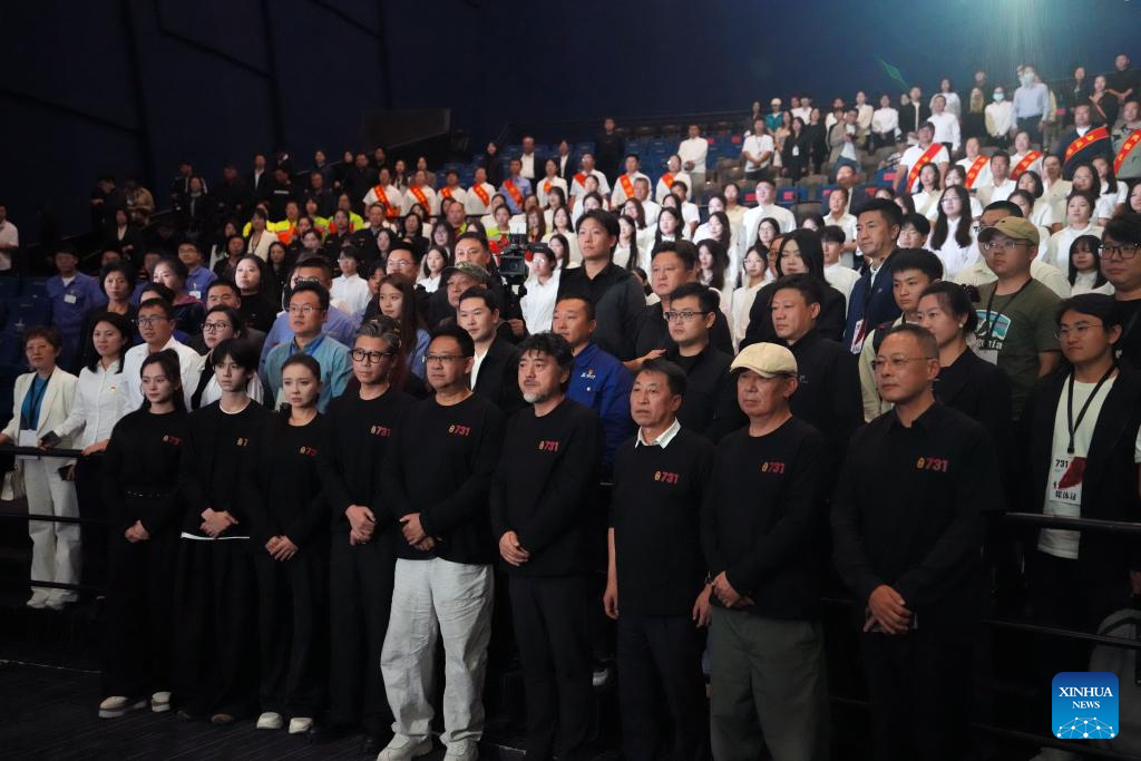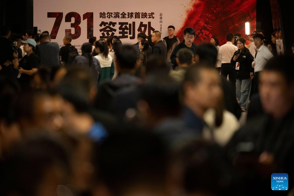 People are seen at the world premiere of the film "Evil Unbound" in Harbin, northeast China's Heilongjiang Province, Sept. 17, 2025. "Evil Unbound," a film about Unit 731, held its world premiere on Wednesday in Harbin, where this notorious Japanese germ warfare unit was once based, highlighting the atrocities committed by Japanese invading forces in China in World War II.