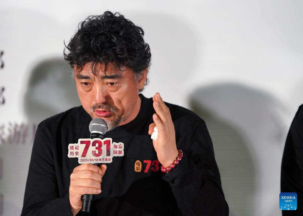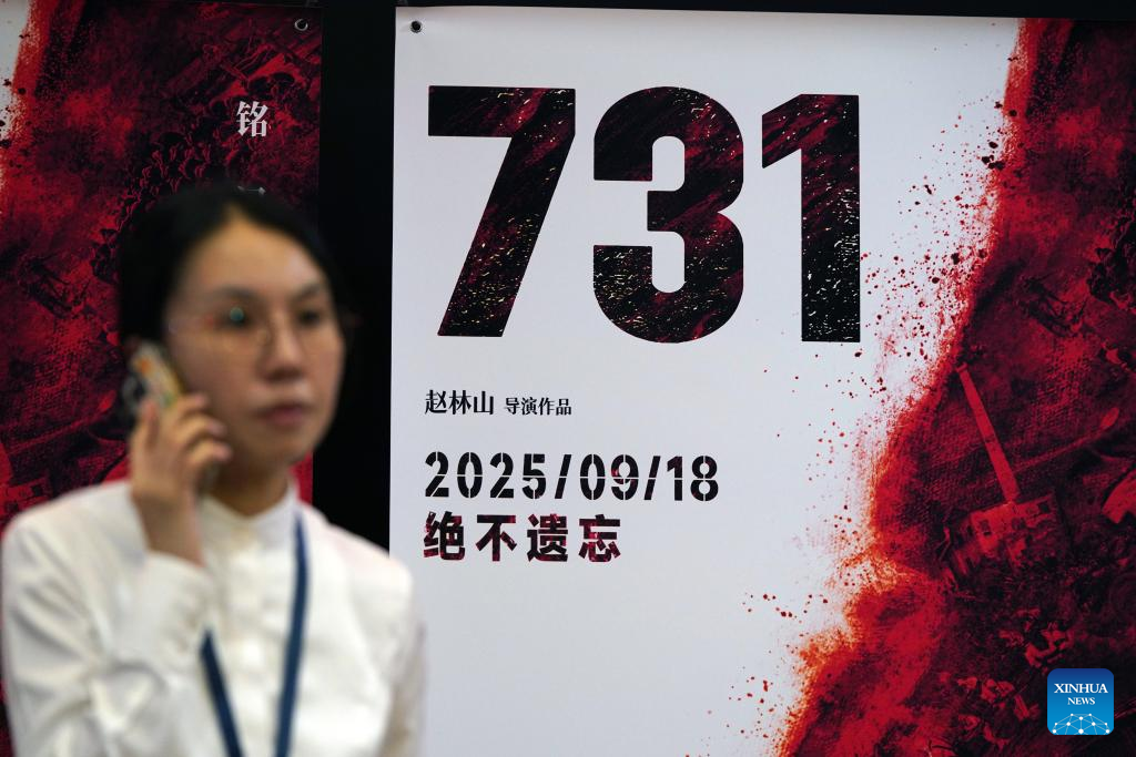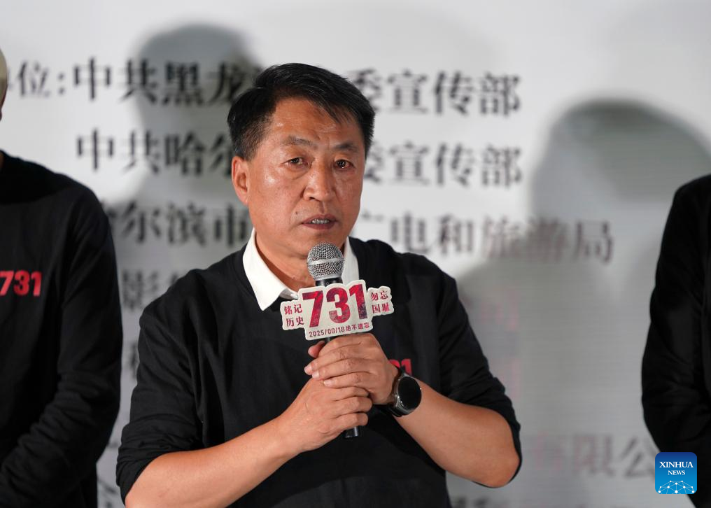 This photo taken on Sept. 17, 2025 shows the world premiere of the film "Evil Unbound" in Harbin, northeast China's Heilongjiang Province. "Evil Unbound," a film about Unit 731, held its world premiere on Wednesday in Harbin, where this notorious Japanese germ warfare unit was once based, highlighting the atrocities committed by Japanese invading forces in China in World War II. The movie tells the story of Wang Yongzhang, a local vendor, and others imprisoned in the "special prison" of Unit 731, where they were lured by false promises of freedom in return for cooperating with supposed health checks and disease prevention research, only to become victims of horrific medical experiments, including frostbite tests, gas exposure and vivisection. (Xinhua/Zhang Tao)