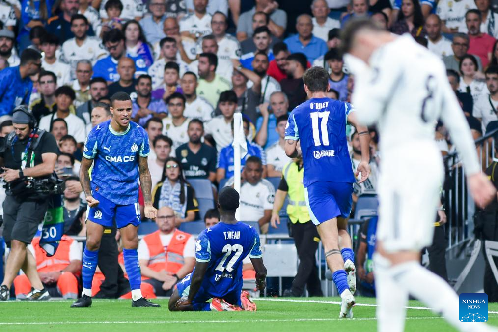 Players of Olympique Marseille celebrate a goal during the first round match of UEFA Champions League between Real Madrid and Olympique Marseille in Madrid, Spain, on Sept. 16, 2025. (Photo by Gustavo Valiente/Xinhua)