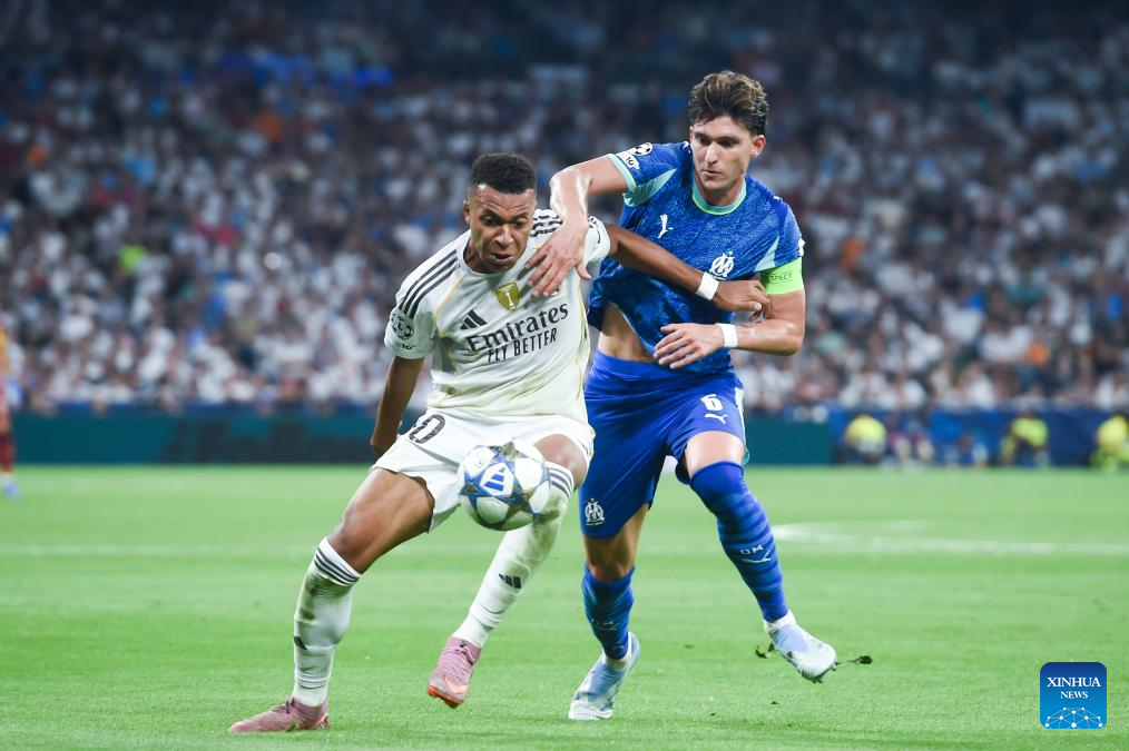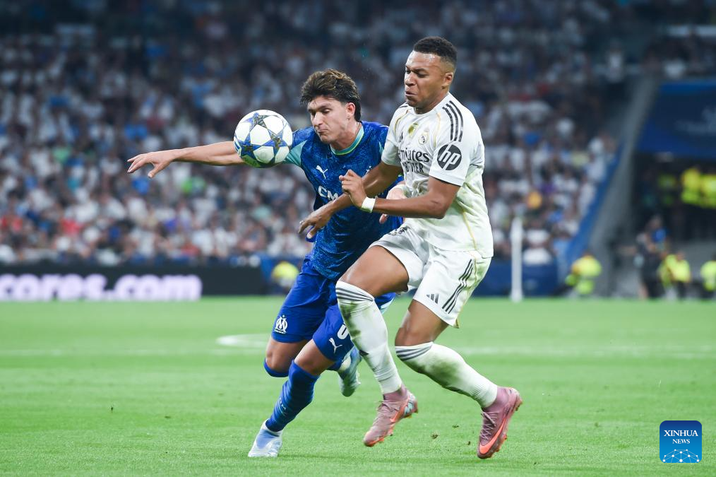 Kylian Mbappe (L) of Real Madrid vies with Leonardo Balerdi of Olympique Marseille during the first round match of UEFA Champions League between Real Madrid and Olympique Marseille in Madrid, Spain, on Sept. 16, 2025. (Photo by Gustavo Valiente/Xinhua)