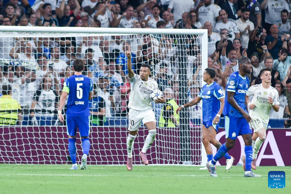 Kylian Mbappe of Real Madrid celebrates a goal during the first round match of UEFA Champions League between Real Madrid and Olympique Marseille in Madrid, Spain, on Sept. 16, 2025. (Photo by Gustavo Valiente/Xinhua)