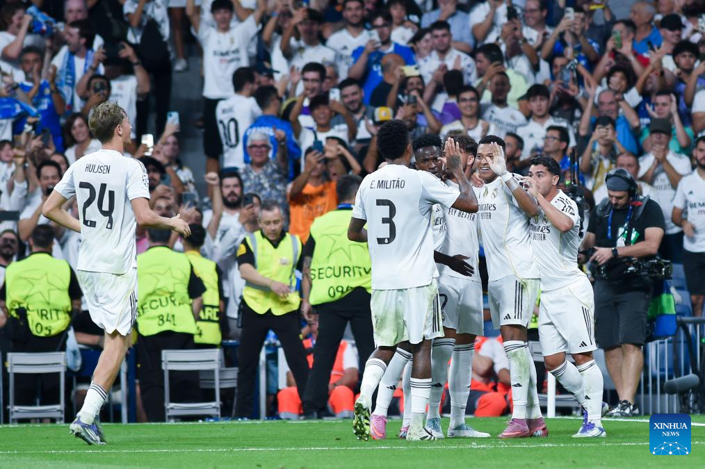 Players of Real Madrid celebrate a goal during the first round match of UEFA Champions League between Real Madrid and Olympique Marseille in Madrid, Spain, on Sept. 16, 2025. (Photo by Gustavo Valiente/Xinhua)