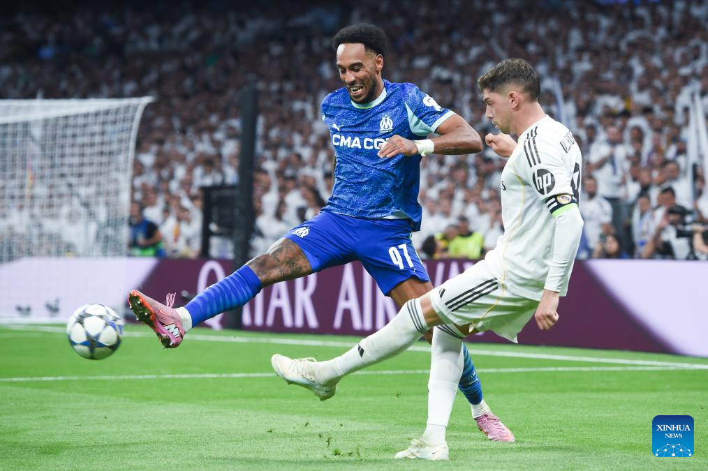 Federico Valverde (R) of Real Madrid vies with Pierre-Emerick Aubameyang of Olympique Marseille during the first round match of UEFA Champions League between Real Madrid and Olympique Marseille in Madrid, Spain, on Sept. 16, 2025. (Photo by Gustavo Valiente/Xinhua)
