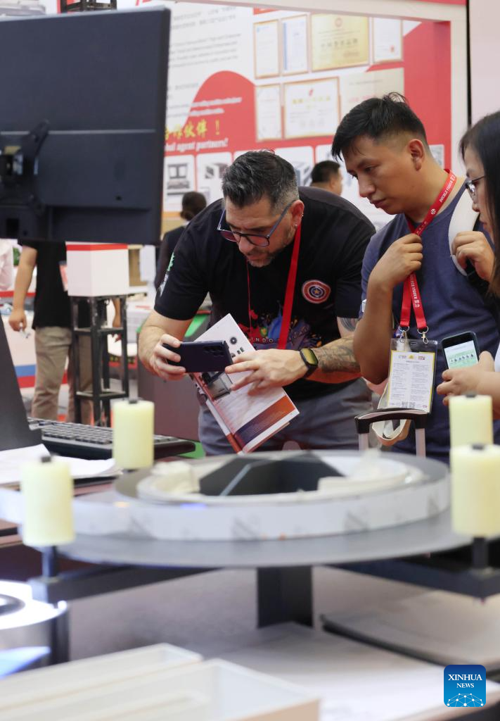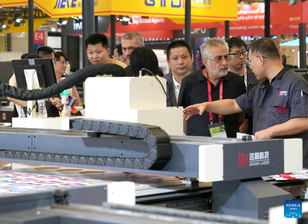 A visitor learns about a 3D printing device for the production of advertising signs at the 26th edition of the Sign China expo in Shanghai, east China, Sept. 17, 2025. The three-day expo on advertising industry, which kicked off at Shanghai New International Expo Centre on Wednesday, showcases products and technologies including advanced advertising production equipment, advertising materials, LED advertising lighting, and LED displays brought by approximately 800 exhibitors from home and abroad. (Xinhua/Liu Ying)