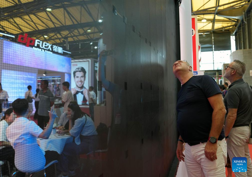 Visitors learn about a see-through LED display at the 26th edition of the Sign China expo in Shanghai, east China, Sept. 17, 2025. The three-day expo on advertising industry, which kicked off at Shanghai New International Expo Centre on Wednesday, showcases products and technologies including advanced advertising production equipment, advertising materials, LED advertising lighting, and LED displays brought by approximately 800 exhibitors from home and abroad. (Xinhua/Liu Ying)