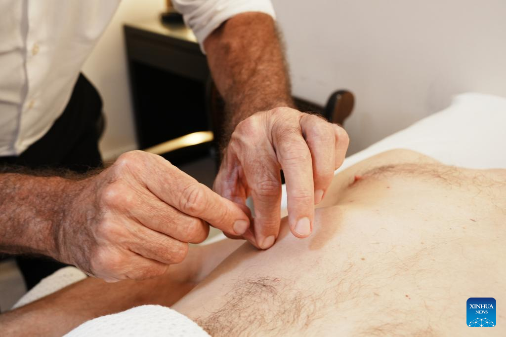 Acupuncturist Gerad Kite gives an acupuncture treatment to James Eden, a film producer and also co-writer of his book "The Untapped Self," in London, Britain, Sept. 4, 2025. (Xinhua/Zhao Jiasong)