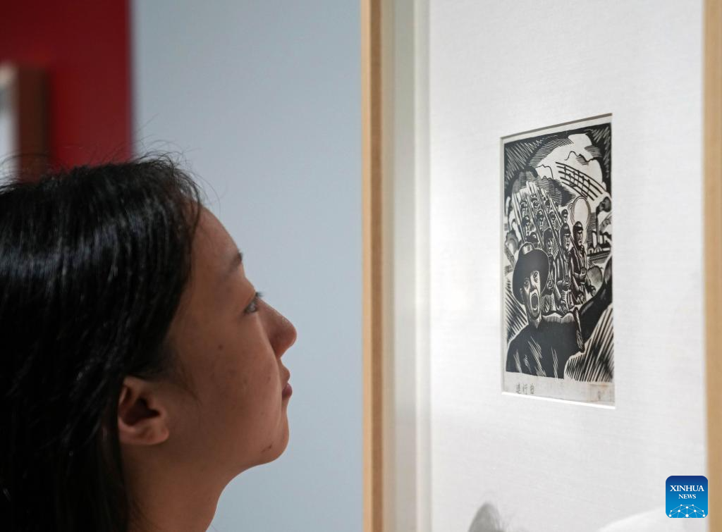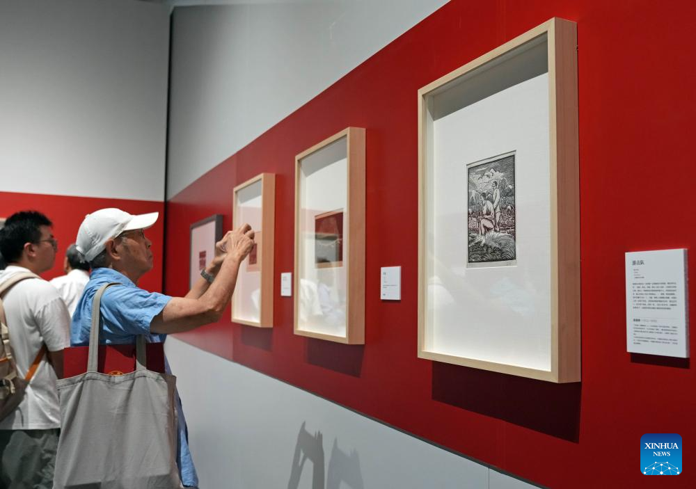 A visitor views a piece of work at a woodblock painting exhibition in commemoration of the 80th anniversary of the victory of the Chinese People's War of Resistance against Japanese Aggression and the World Anti-Fascist War in Shanghai, east China, Sept. 18, 2025. Kicking off Thursday at Shanghai Jiao Tong University, the exhibition showcases over 120 woodblock paintings. (Xinhua/Liu Ying)