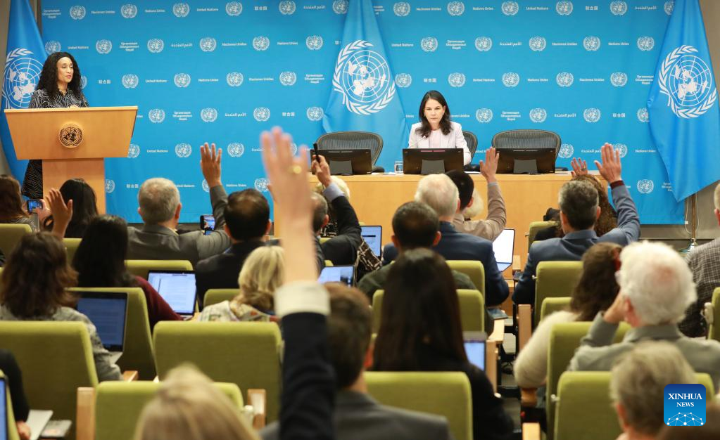 Annalena Baerbock (R, Rear), president of the 80th session of the United Nations General Assembly (UNGA), holds a press conference at the UN headquarters in New York, Sept. 17, 2025. The 80th session of the UN General Assembly (UNGA) will focus on such issues as advancing the UN80 reform agenda, guiding the selection of the next UN secretary-general, and regaining momentum on the Sustainable Development Goals (SDGs), said Baerbock on Wednesday. (Xinhua/Xie E)